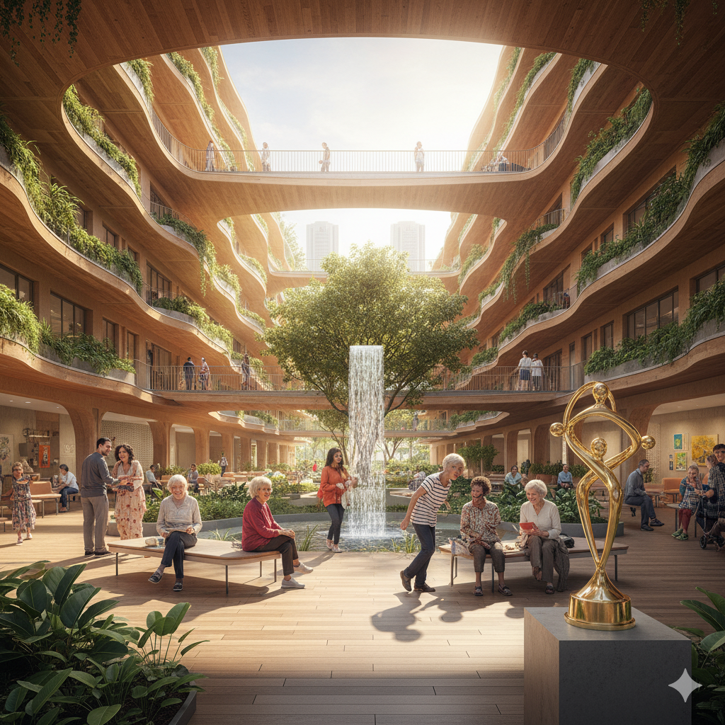 O projeto, que consiste em 59 apartamentos para pessoas com mais de 65 anos, estabelece um novo e elevado padrão para moradias sociais, contrastando radicalmente com o clima institucional frequentemente associado a casas de repouso tradicionais.