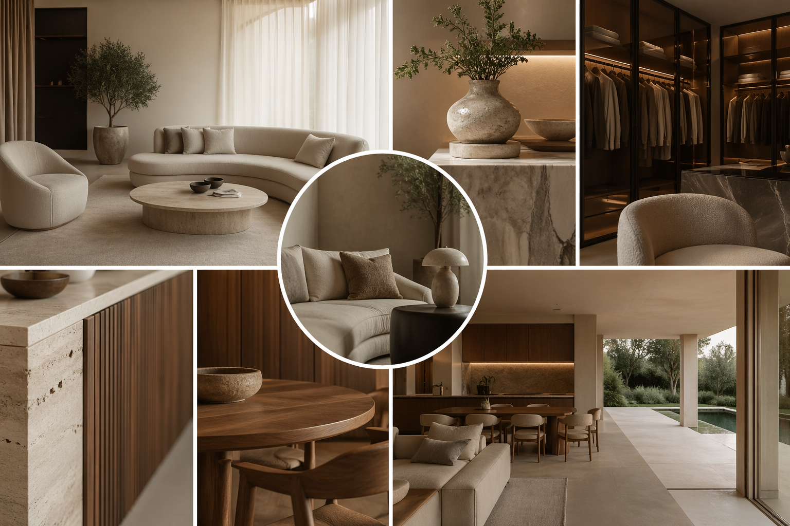 Cores Neutras e Atemporais: Paletas de bege, cinza, terra e branco que criam uma base visual descansada.